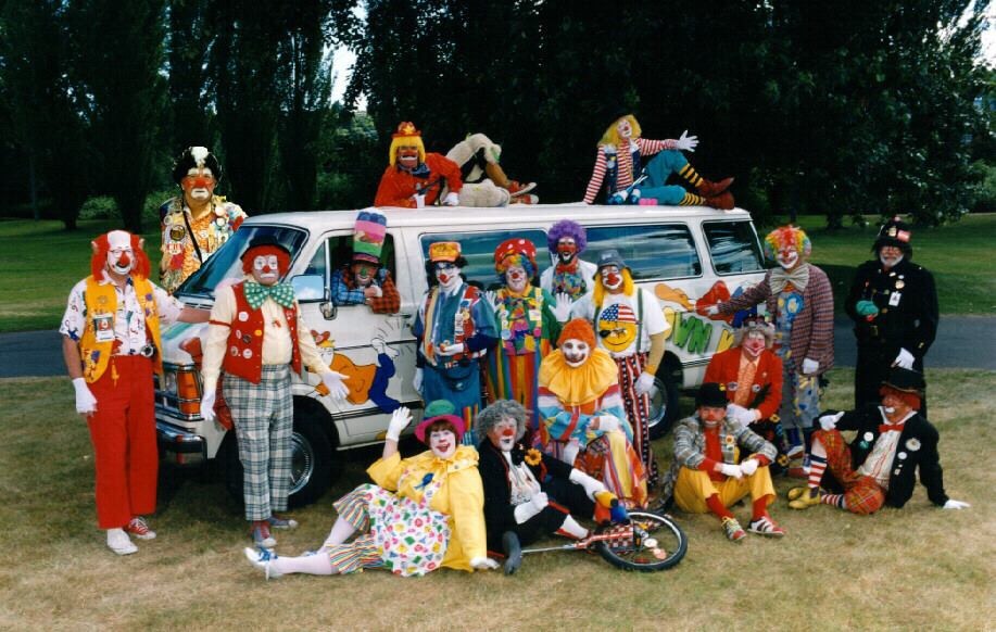 A picture of the Boeing Klowns posing with their brand new clown van. It’s amazing to see so many in one place. Though our numbers haven’t decreased it is rather tough to get every one of them in a photo shoot. That’s actually the case here, by the way. Despite the large attendance, one clown couldn’t make it and had to be photoshopped in. Can you guess which clown wasn’t there that day?*
